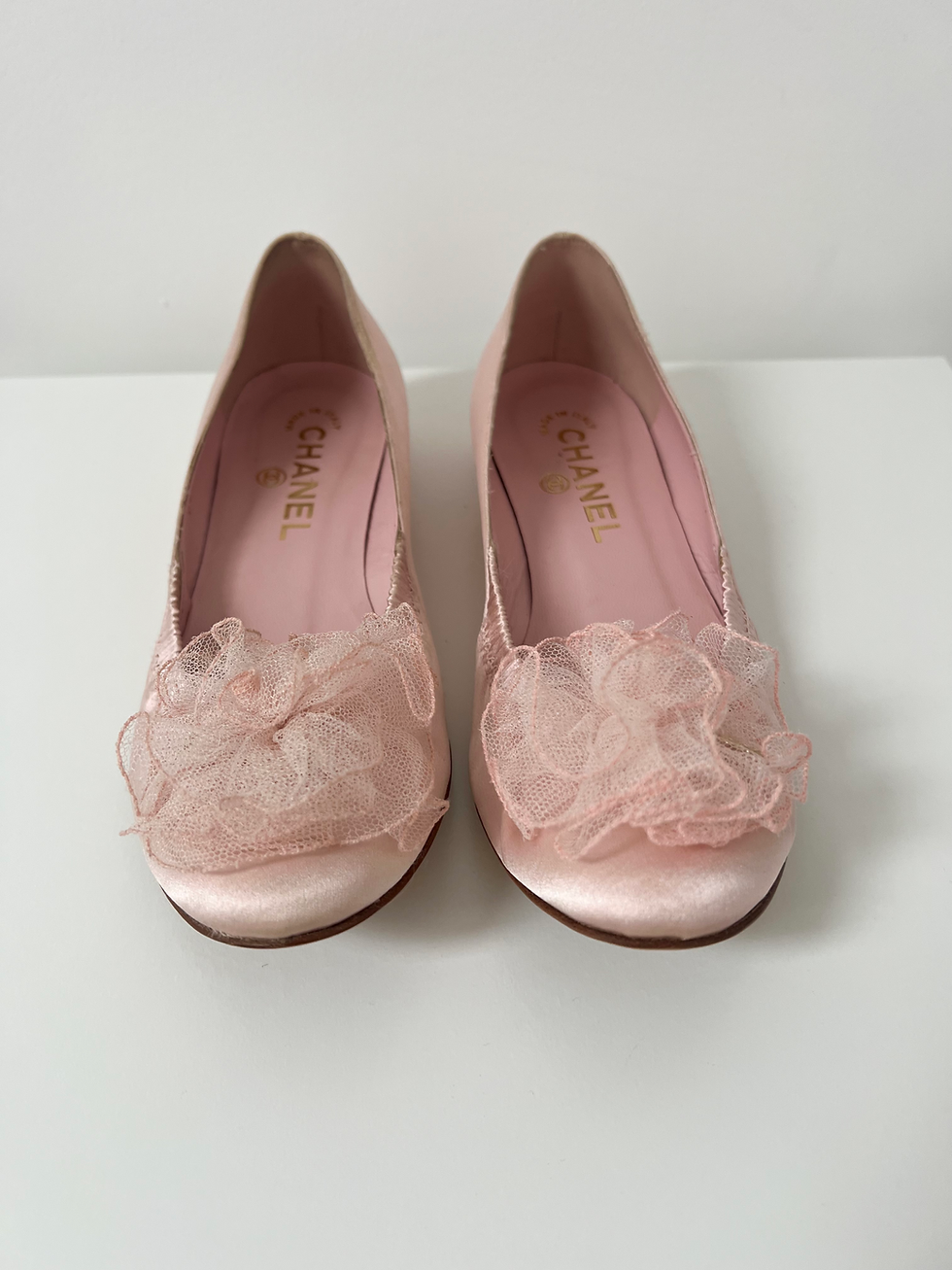 Chanel Pink Satin Vintage Flower Ballerina Pumps Size 37.5